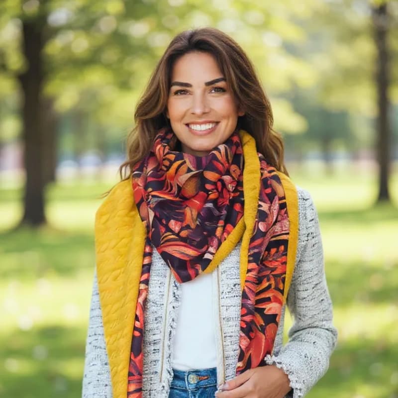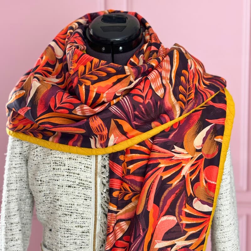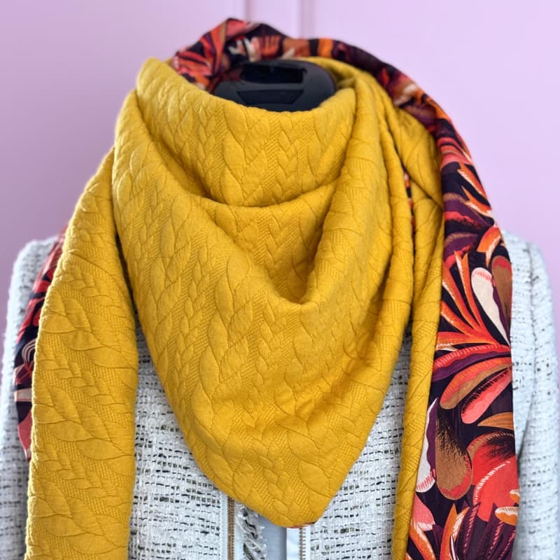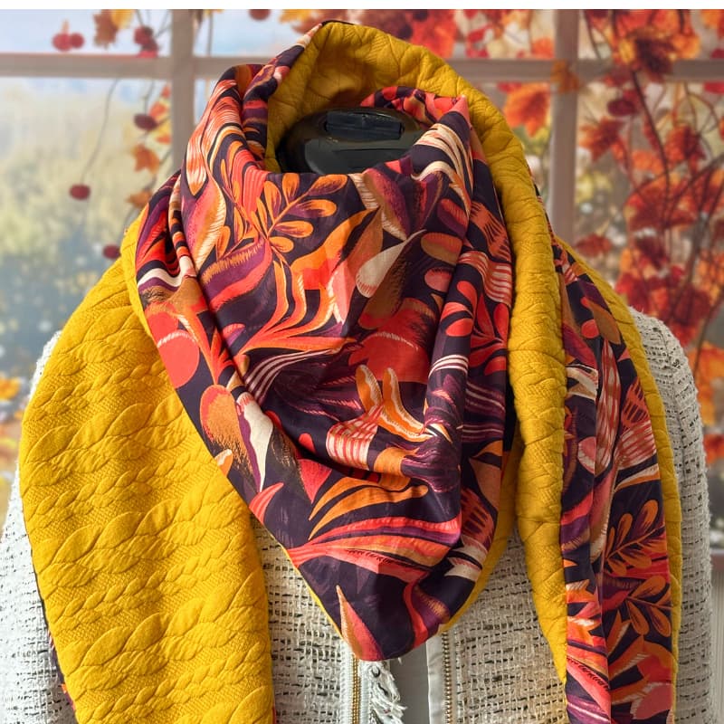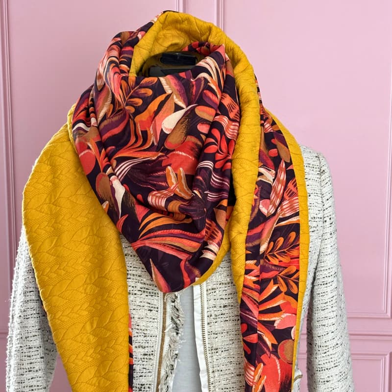 Découvrez le chèche femme jaune « Adenium« , un grand foulard triangulaire conçu pour ajouter une touche de style en toutes saisons.
