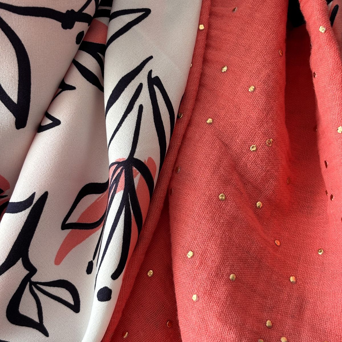 - Double gaze corail à pois dorés : rehaussée de petits pois pailletés, pour une touche précieuse et lumineuse