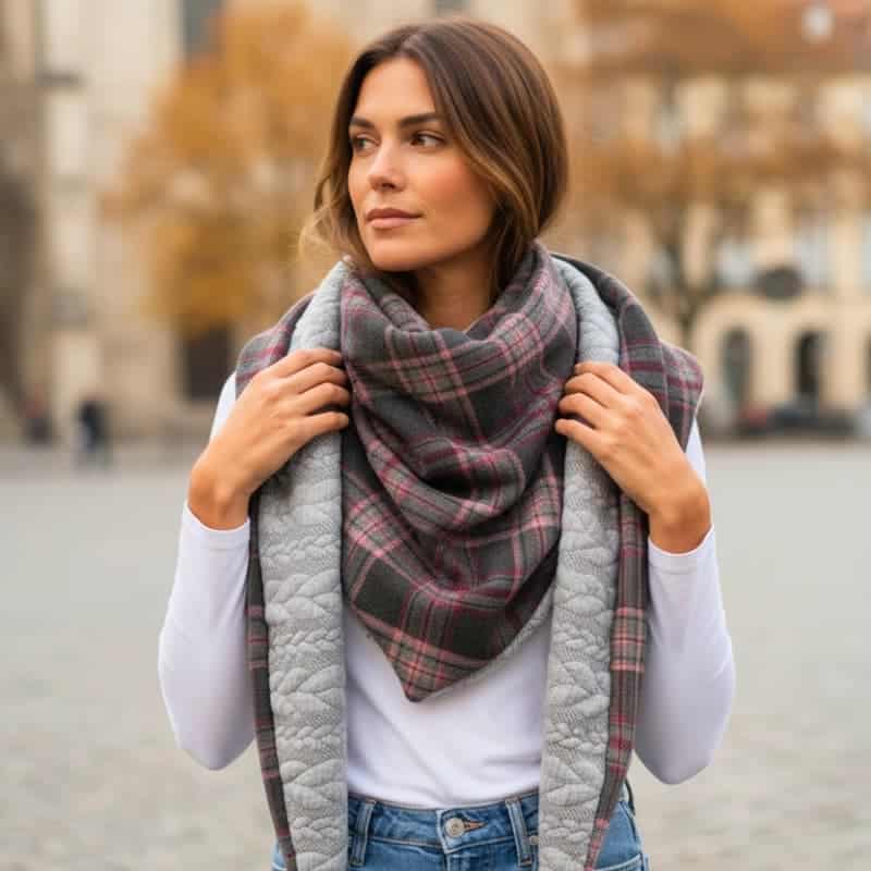 - Polyvalence de style : Peut être porté en étole pour une élégance sophistiquée ou en écharpe pour un look moderne et décontracté.