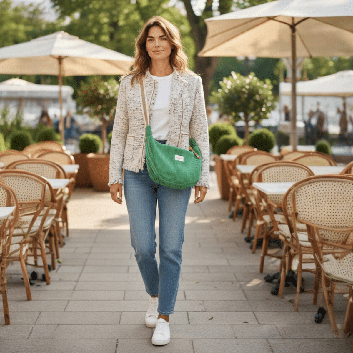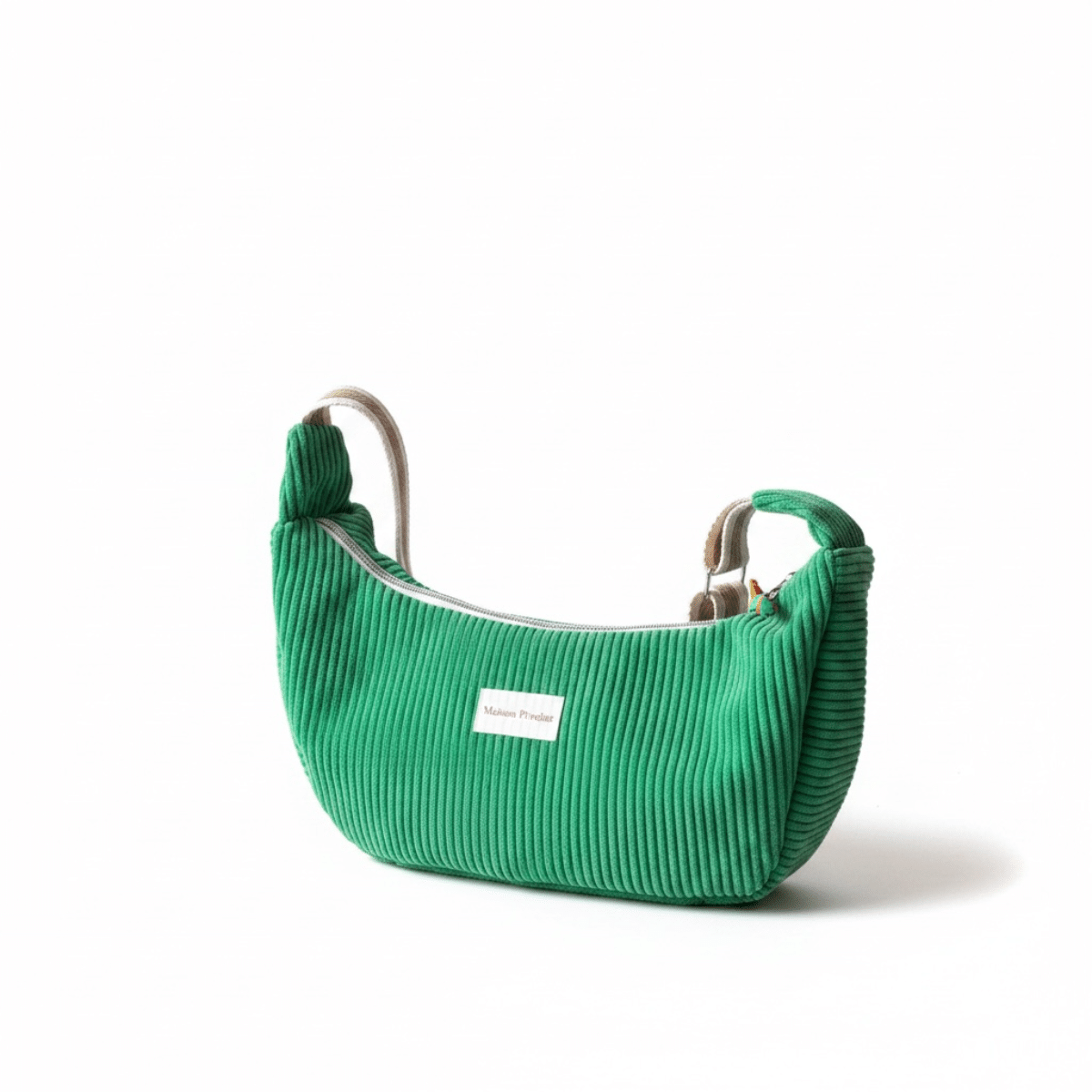 Le sac croissant « Cosmos » coche toutes les cases : une forme galbée ultra tendance, une matière texturée en velours côtelé, et une sangle bicolore qui donne du pep’s à votre look.